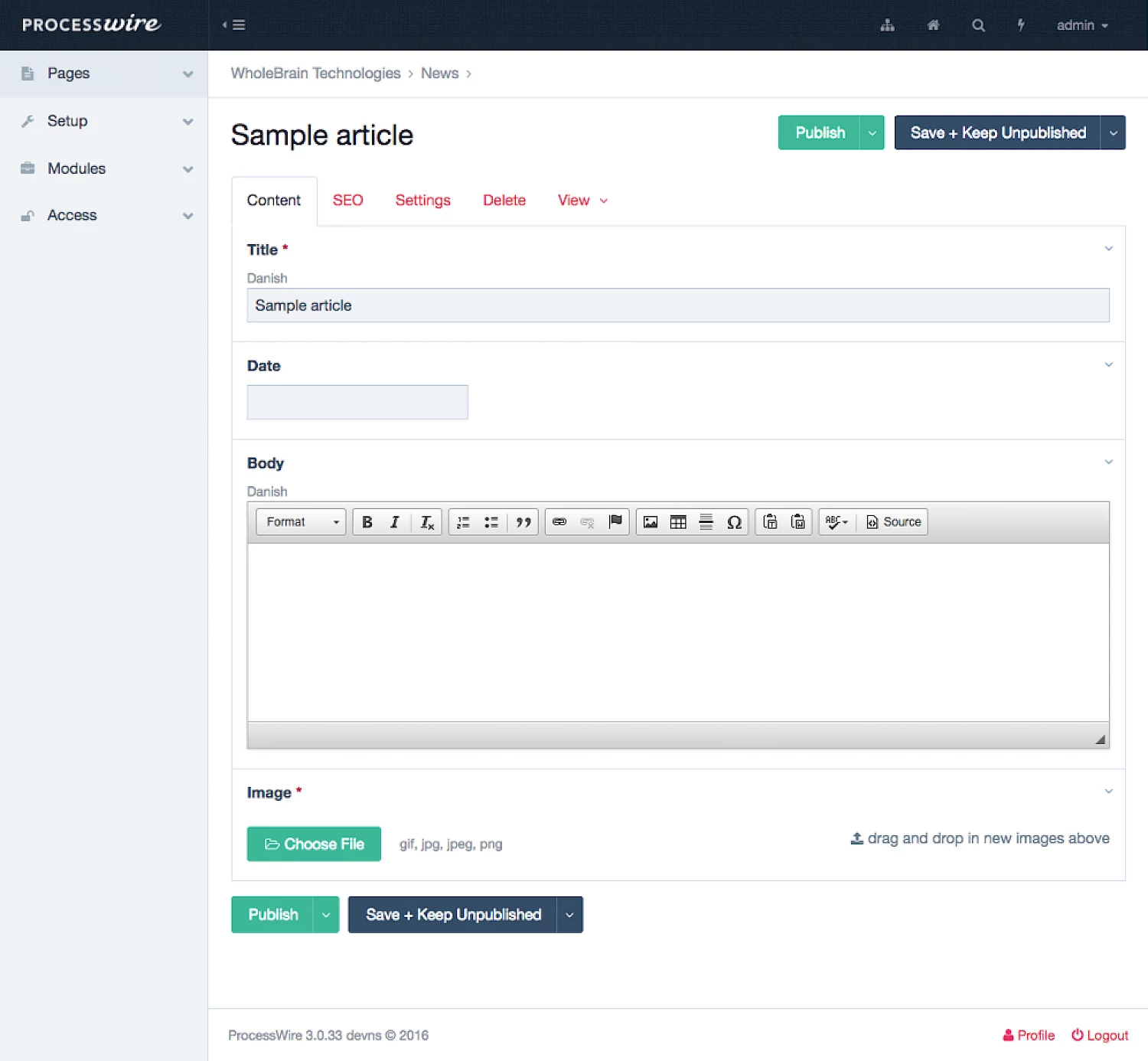 There it was, a CMS that made zero assumptions of what I was going to build. You get a blank slate, and you start by outlining the fields necessary to the content you have. Take a news article for example. Think of that as a type of page, or as it’s called in PW, a template. You create a template for news articles, and you add fields: title, date, body, photo. Need photos to be multiple? Set the number of images on the photo field to unlimited. Need an extra field for summary? Add that. You put in exactly the fields you need and nothing more. Now when you create a new page of the “news article” type, you get a neat form that explains itself: