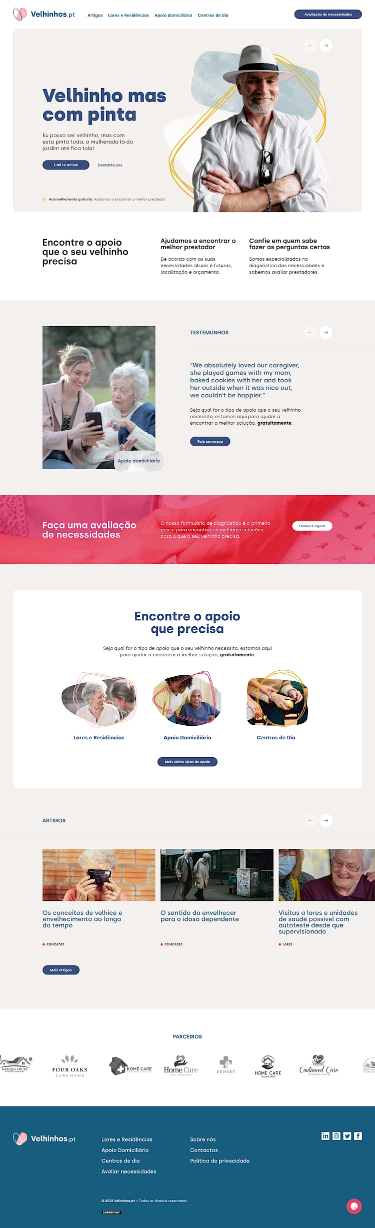 Velhinhos is a service that connects the elderly with caregivers. In this project we started by helping establish the name, then developed the brand identity, design system, communication and website, closing the circle of the company's marketing strategy. In the end, we delivered a complete toolkit that allowed the business activation, communication and sales.